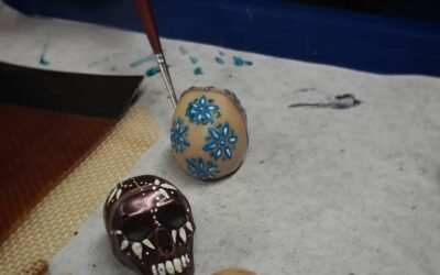 Rachel’s painting THE DEAD: spicy caramel skulls. One is heirloom chile caramel in cinnamon-infused housemade white chocolate, while the other is dark…
