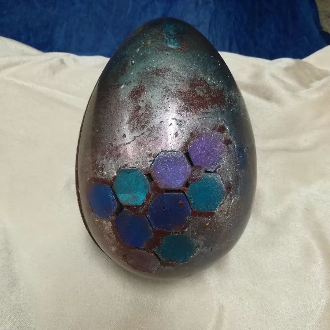 “Blue Beehive” Chocolate Egg March 16, 2023March 16, 2023Edible Art Large egg with pistachio gianduja and red walnuts filled with spiced peach marshmallow and allspice marshmallow.