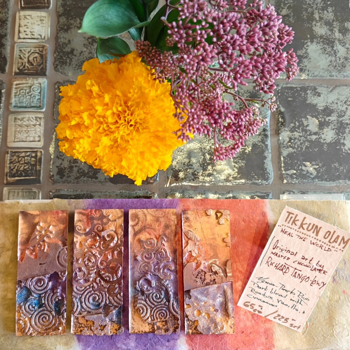We craft these sculptural chocolate bars from original works by artist Teresa Moorehouse. Each bar is hand-painted with a combination of tinted cocoa butter and colored mica dust to create a specific look and mood. We usually keep several of each in the shop, and can easily make them to order.