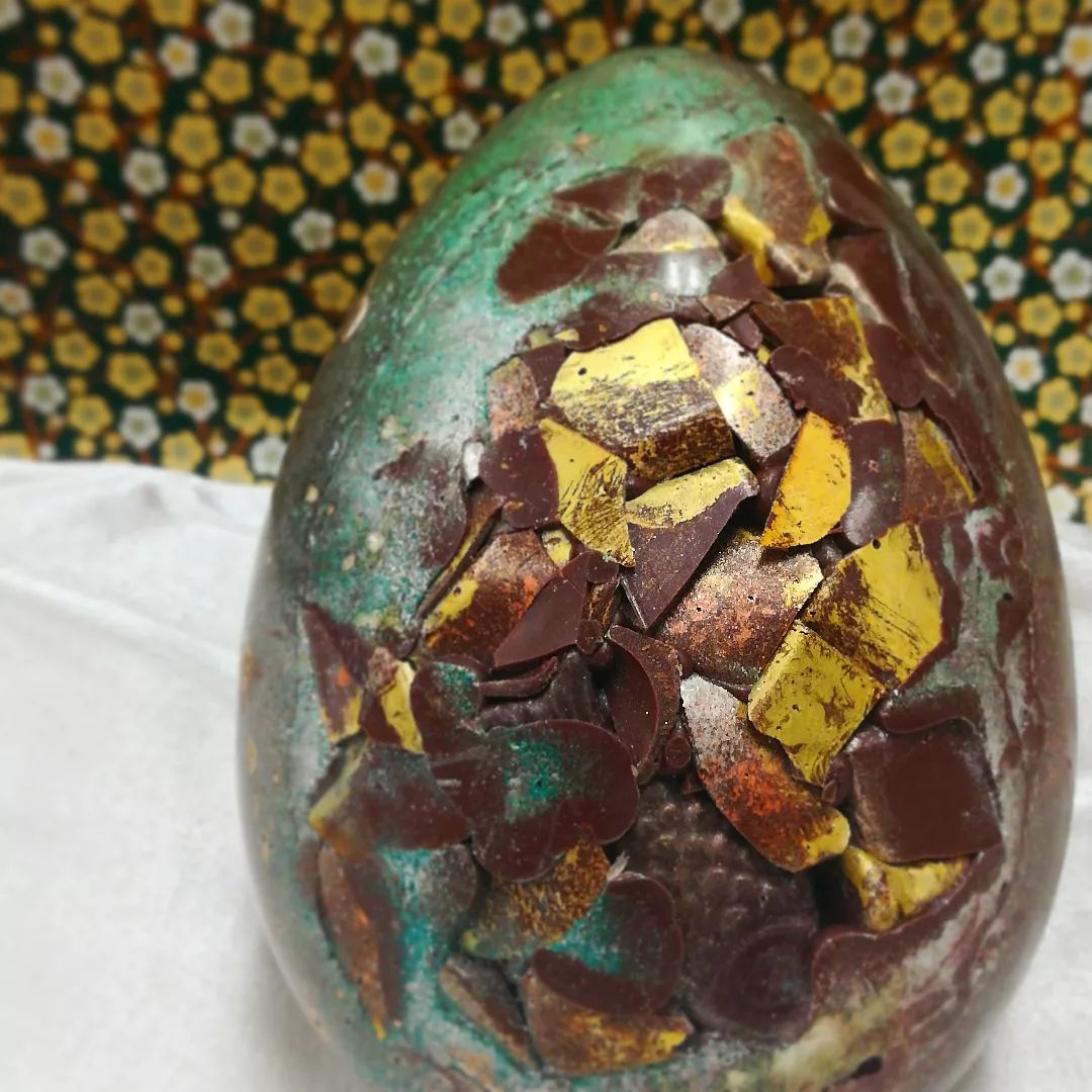 “Emerald Age” Chocolate Egg March 16, 2023March 16, 2023Edible Art Large egg of Belize Criollo Heirloom dark chocolate embedded in Venezuela Cayagua dark milk and filled with allspice marshmallow.