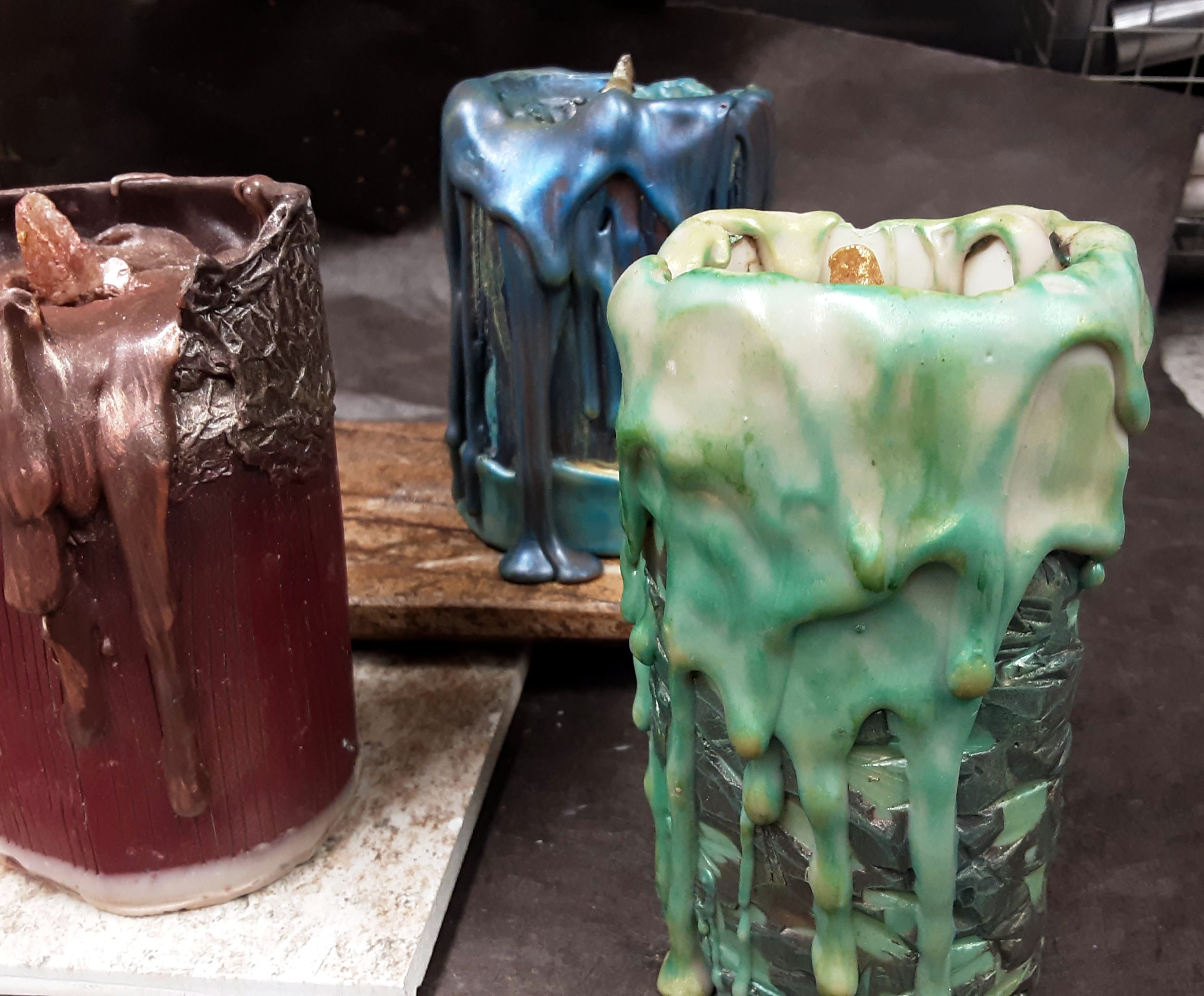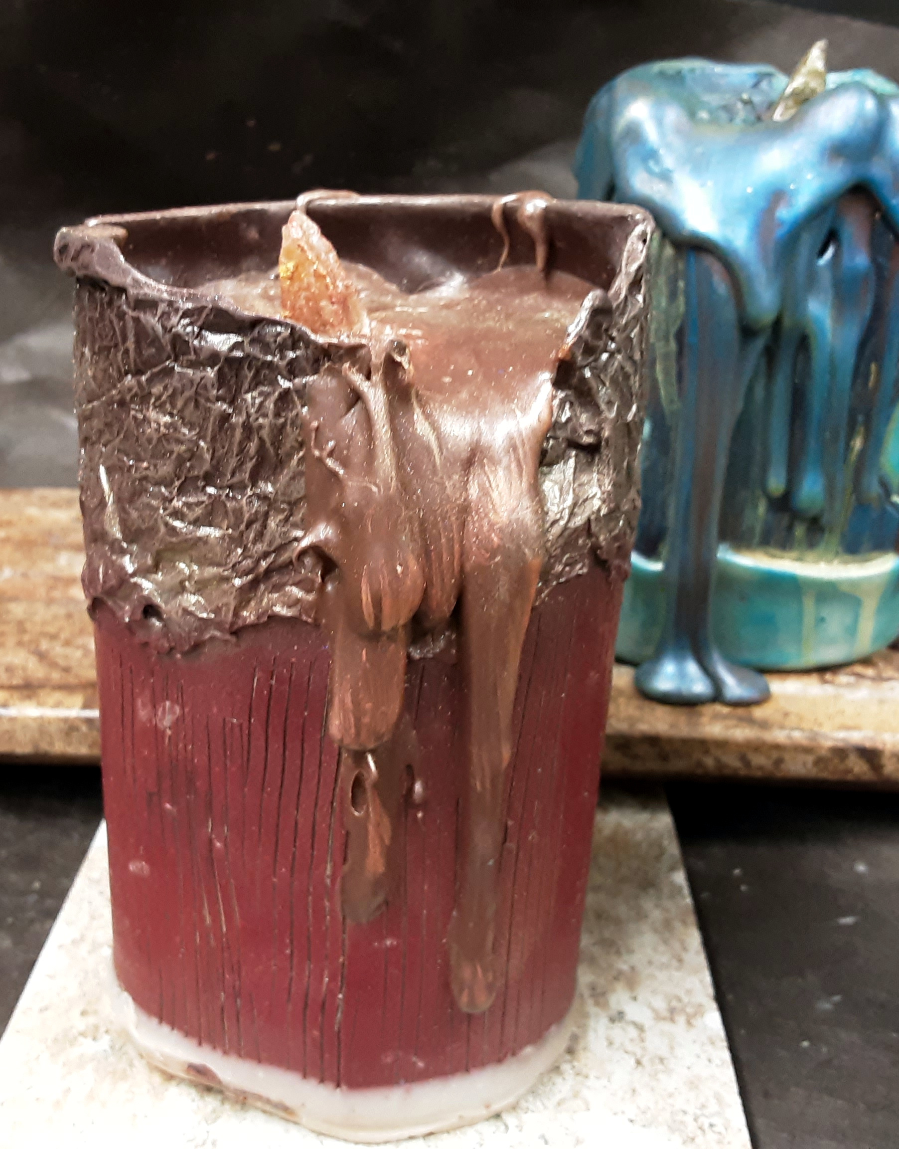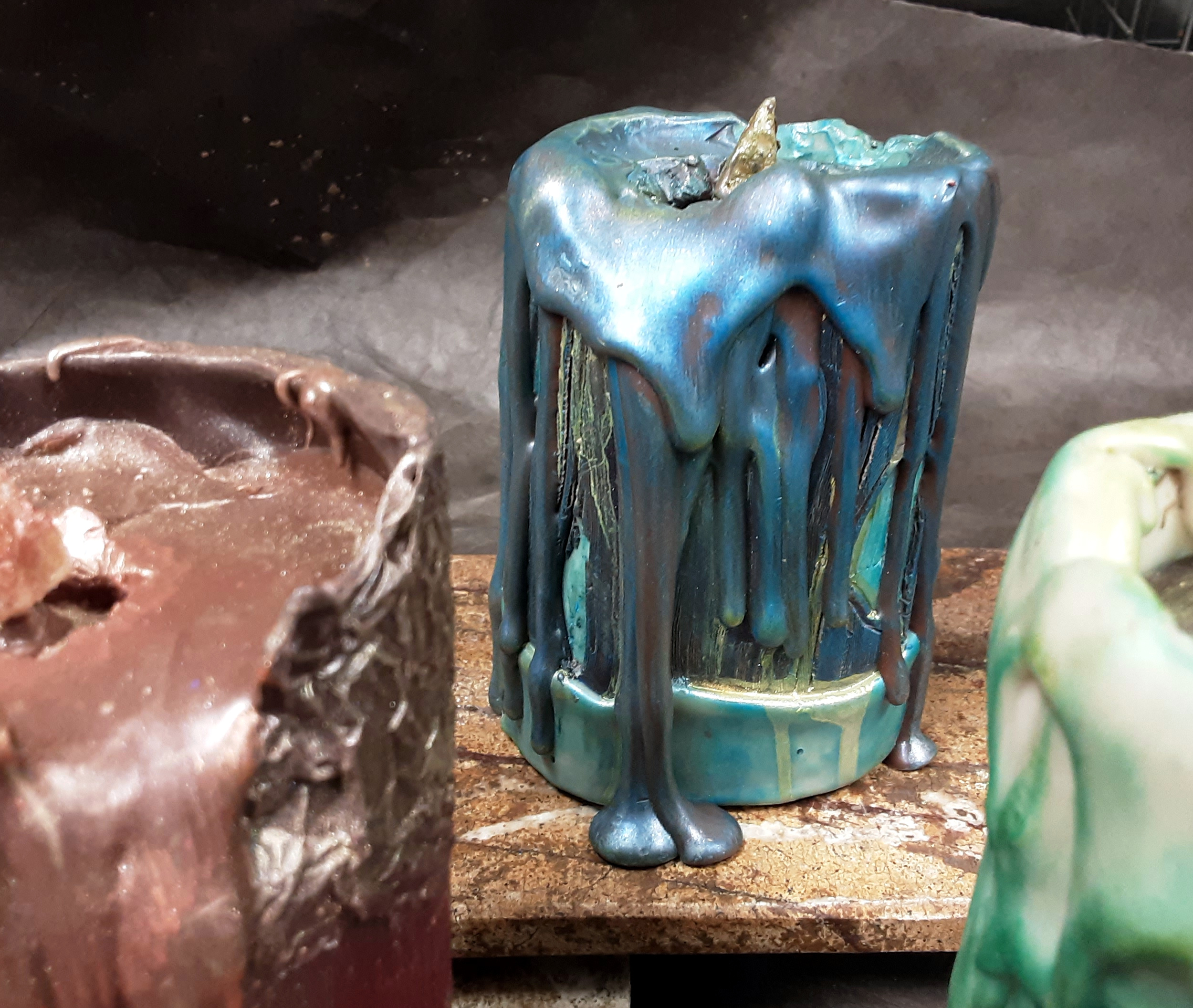 LIGHTING THE WAY – crafted from tea-infused house white and yuzu chocolates and filled with layers of hot chocolate ganache, wulong tea ganache, pumpkin seed & almond praliné, and apricot marshmallow. Each candle is a unique work of art and contains three of the four fillings. The flame is apricot paté de fruit. Perfect for a holiday centerpiece and then dessert.