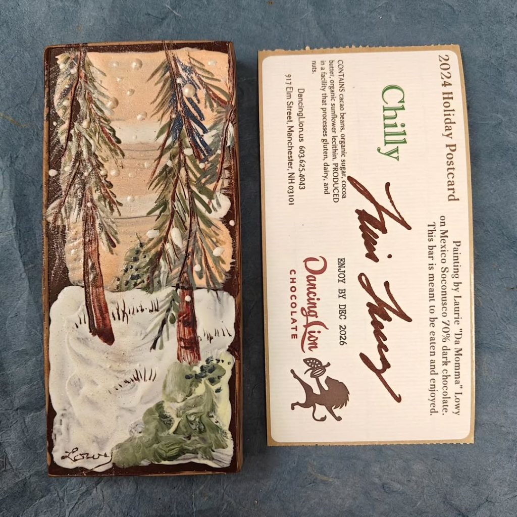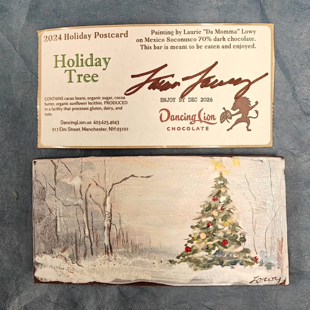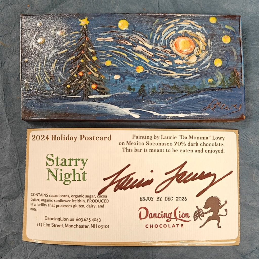 Painted by Laurie “Da Momma” Lowy with colored cocoa butter on Mexico Soconusco 70% bean to bar dark chocolate.