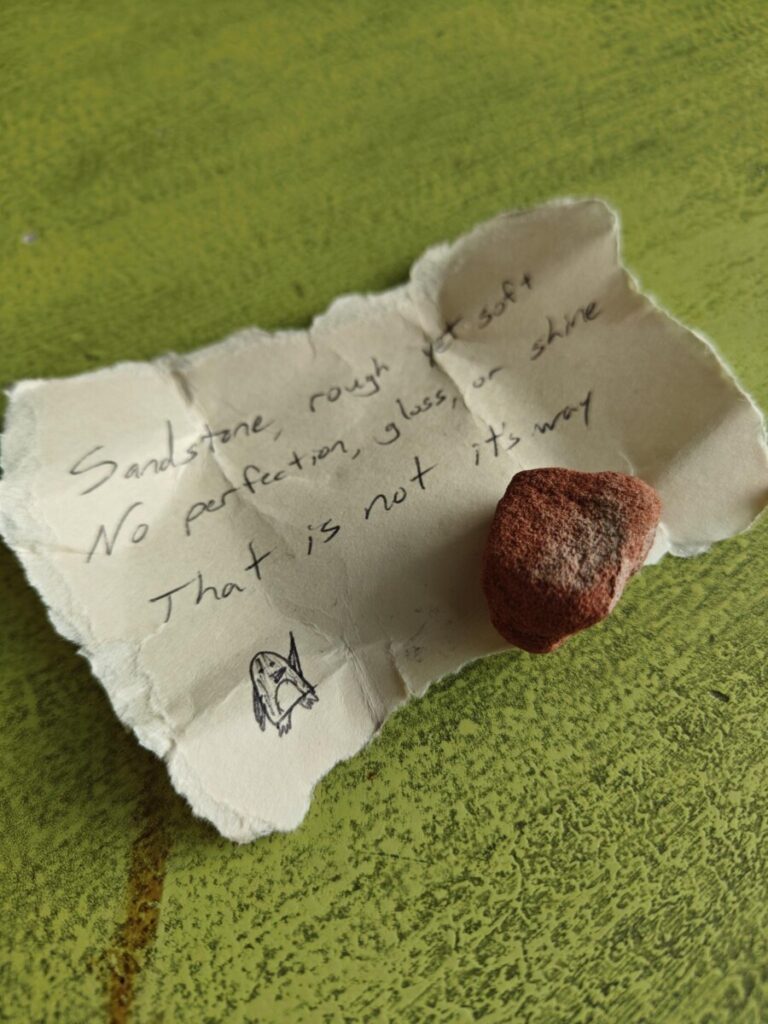 WHEN I ARRIVED IN OLYMPIA I found I had received the gift of a haiku from a friend. The poem was from Roger, along with a small fragment of sandstone and my long-surviving shop teacup. Roger is now living amidst the wild cacao trees of Tranquilidad in Bolivia, but the poem and the stone perfectly reflect (or imperfectly don’t reflect?) a shared life at one of the strangest most eclectic chocolate shops that has probably existed.