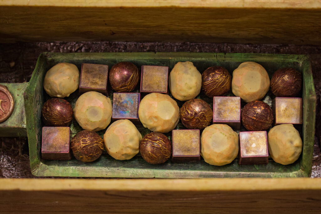 We built the wine bottle from Dominican Republic dark chocolate, which we inlaid top and bottom with cherry marshmallow to buffer the bonbons. The neck of the bottle is filled with Cabernet Sauvignon black pepper caramel and capped with a nougat cork.
