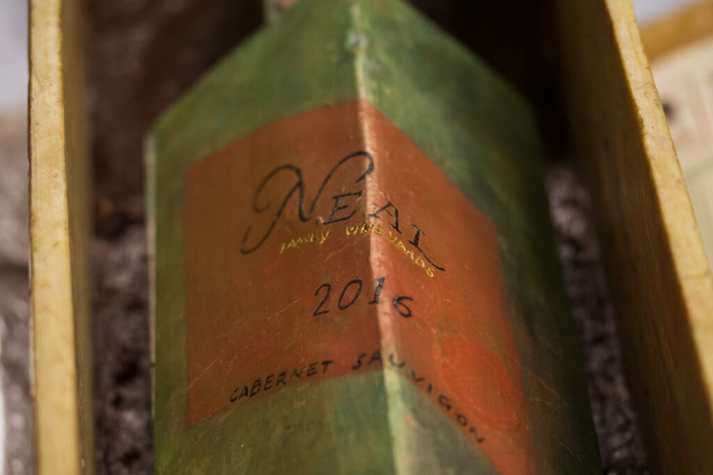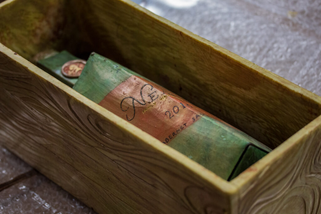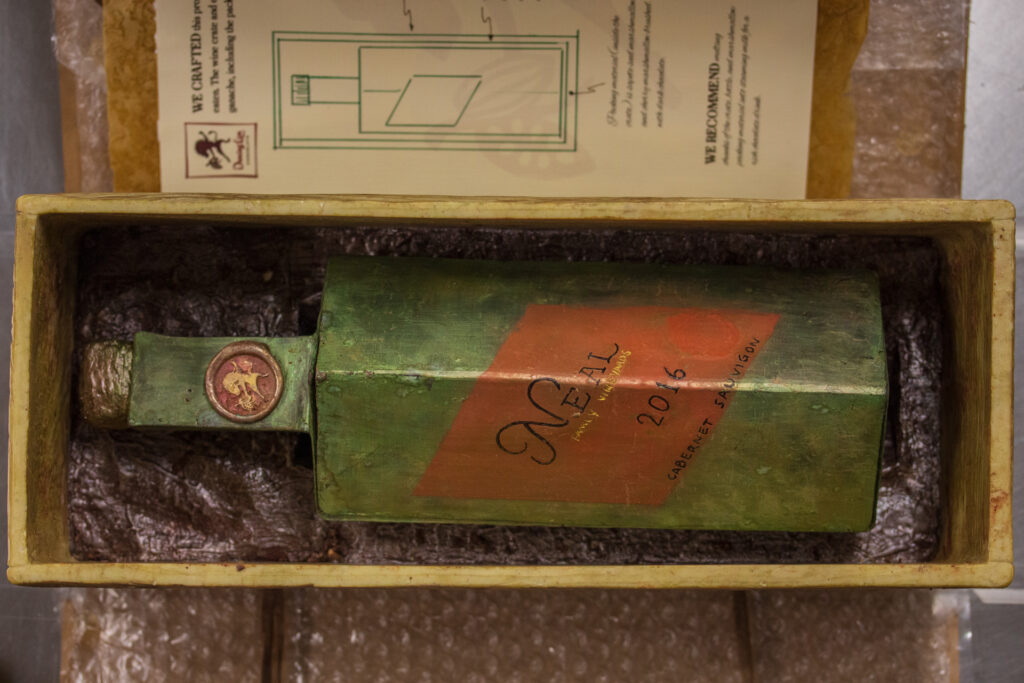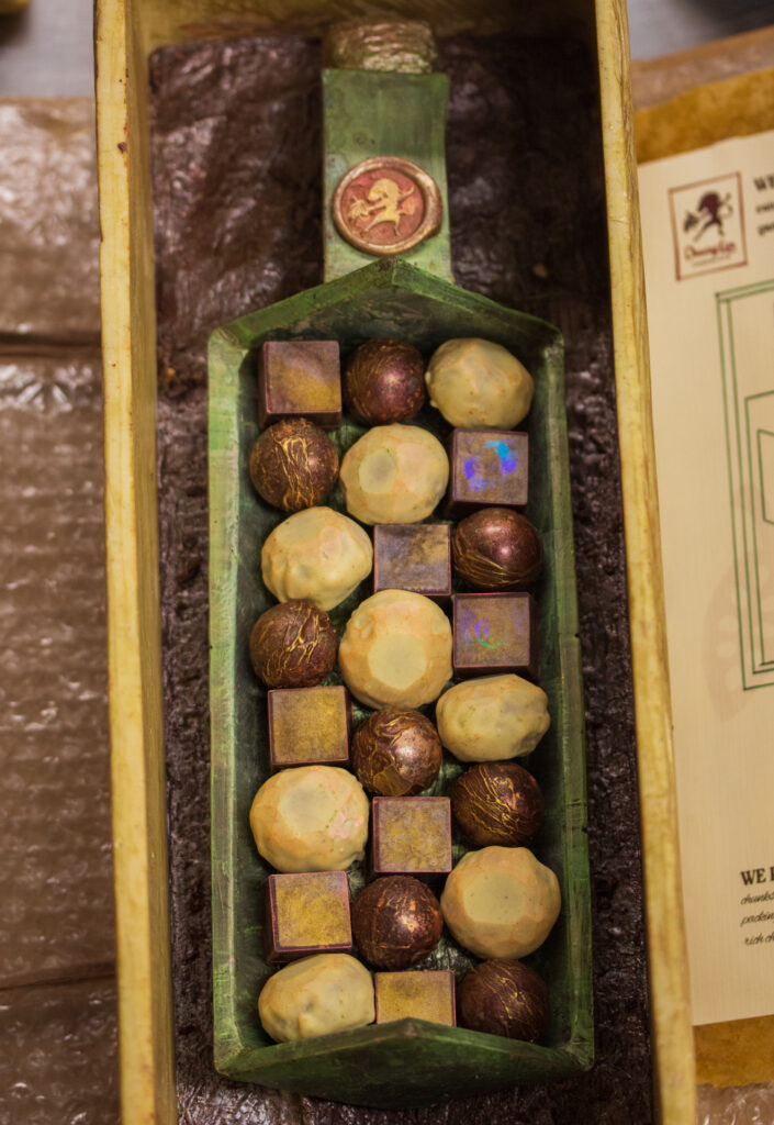 The bottle rests on a bed of sapote marshmallow in a hand-carved spiced white chocolate wine crate, complete with a form-fitting lid. Every part of the project, including the packing materials, was meant to be eaten.