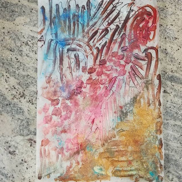 YOU CAN’T GET THERE FROM HERE – Original art for chocolate bark. Dark milk chocolate, mica lustre, and alcohol. The bark itself is dark milk chocolate with chunks of Madagascar Sambirano Valley 100% and coarse sugar.