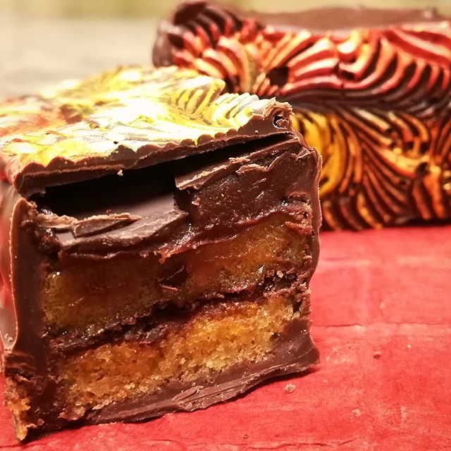 CANDY BAR (“Dog Watch”) – Thai tea ganache over orange turmeric marshmallow over Brazilian honey over baked frangipane (almond paste).