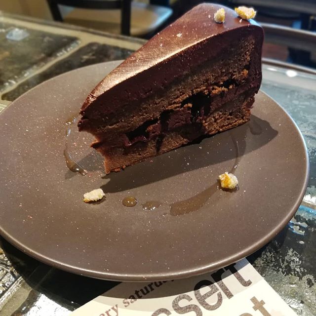 Let them eat cake. August 10, 2019August 10, 2019At Our Cafe CHOCOLATE CAKE – Tanriva caramel sponge with apricot ganache, dried cherries and tangerine for dessert. #chocolatier #dessertnight #cake #valrhona #apricot #fromscratch