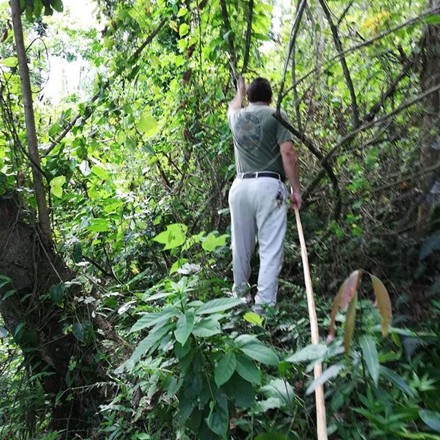 Hunting cacao with farmer Jose Martinez Cruzado of Hacienda Aceitunas. An hour of machete work and scrambling led us to this unusual purple Ancient Criollo cacao on a section of land he hadn’t traveled to since before the storm. These pods are from some *very old* trees.