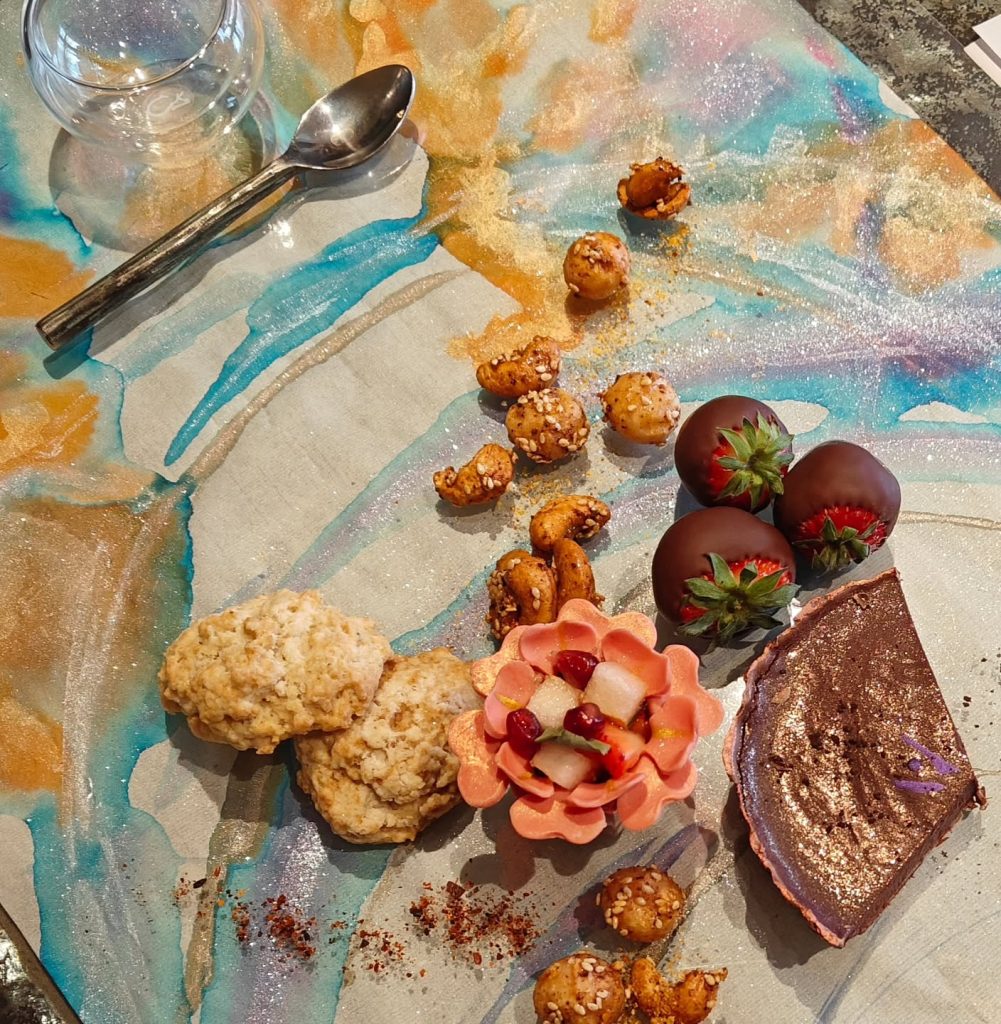 Tart Tart – apricot, plum, Ghana dark chocolate, sesame gianduja crust. Sprinkled with precious Mauritius Starry Night powdered vanilla.
