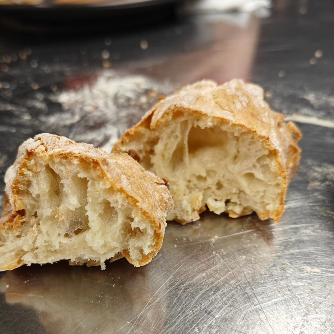 Today and Saturday, ugly but delicious high-hydration baguettes. Beautiful crumb, crisp crust.Enjoy it warm and torn With chocolate and Extra-virgin olive oil.
