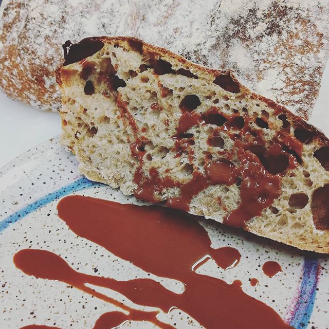 Whole wheat & rye GOOD BREAD with chocolate olive oil drizzle. Made with our own starter.