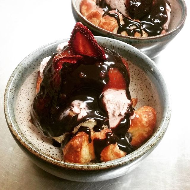 May 20, 2017May 20, 2017At Our Cafe Croissant Sundae. CROISSANT SUNDAES – fresh croissant with blackberry rose ice cream, honey lemon caramel, and Chocolate midnight sauce.