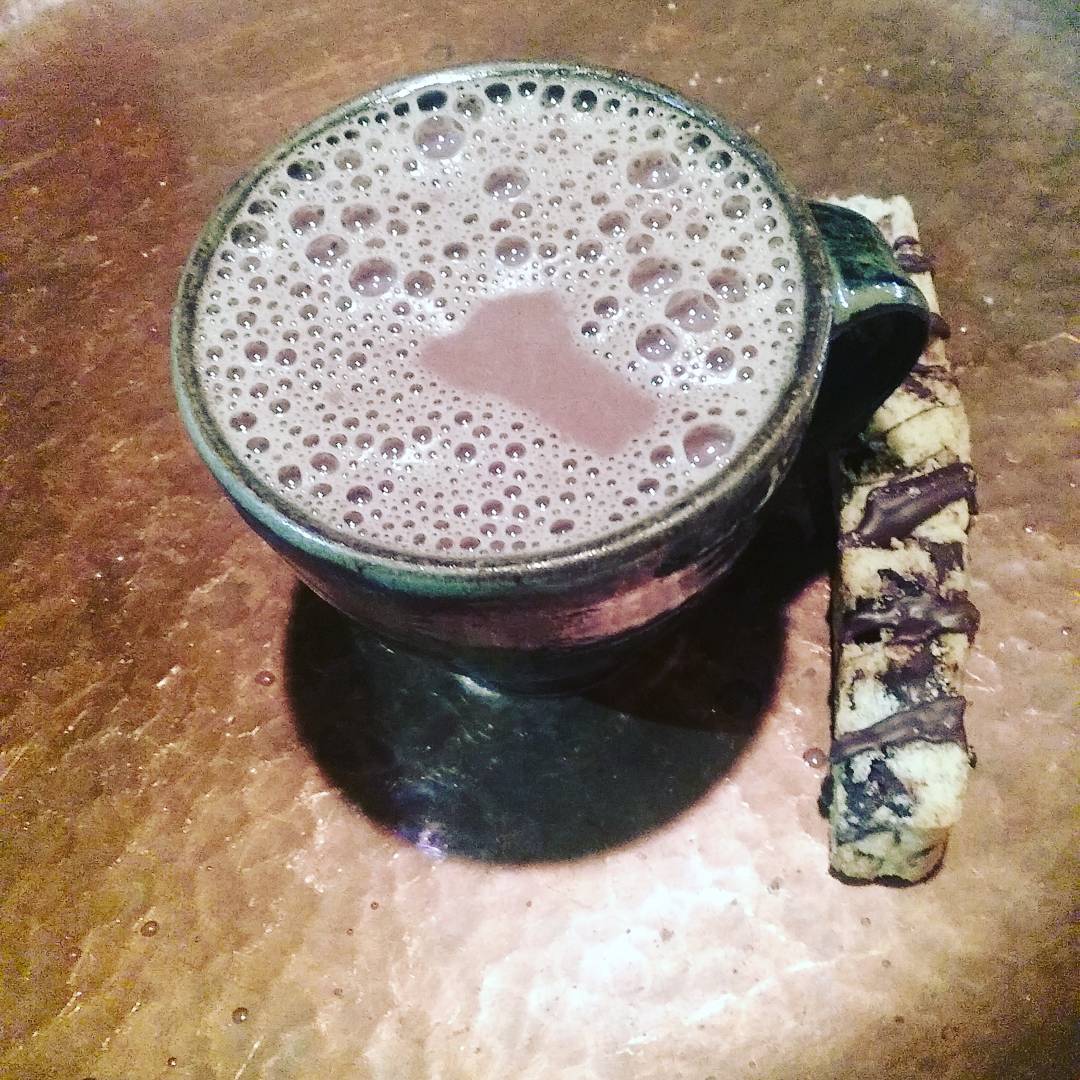 CARAMEL-infused Mayan-style Drinking Chocolate today, until we run out. Tasty with the Blueberry lemon Biscotti