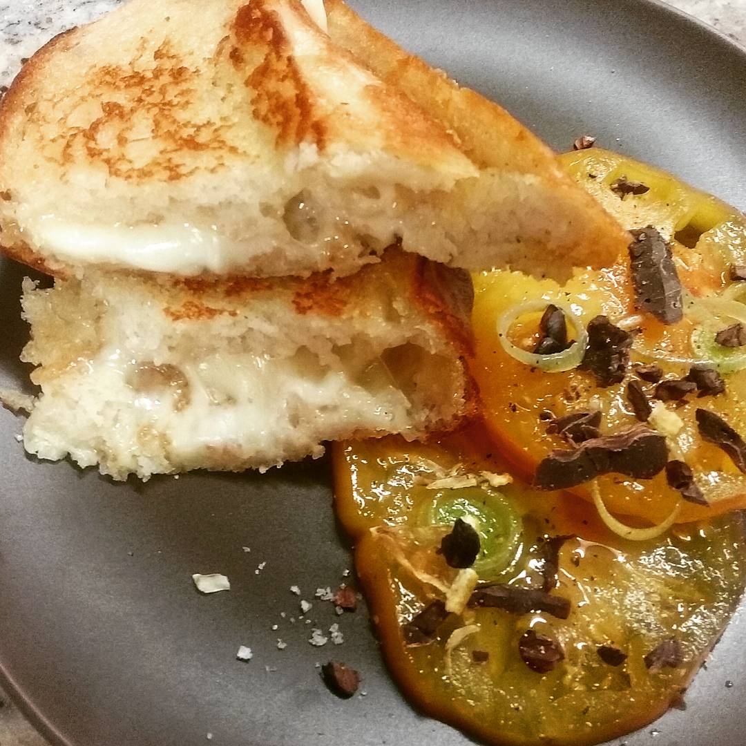 Week of July 26 Lunch at the Lion is a 3 Cheese Grilled Cheese Sandwich (NH, VT, & Basque) served with an Heirloom Tomato Salad and Salad with Madagascar cacao & Liona dark chocolate