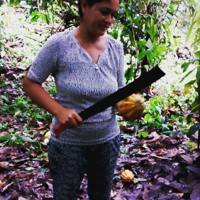 Marianella collecting cacao pods at Cooperativa Nueva Esperanza,