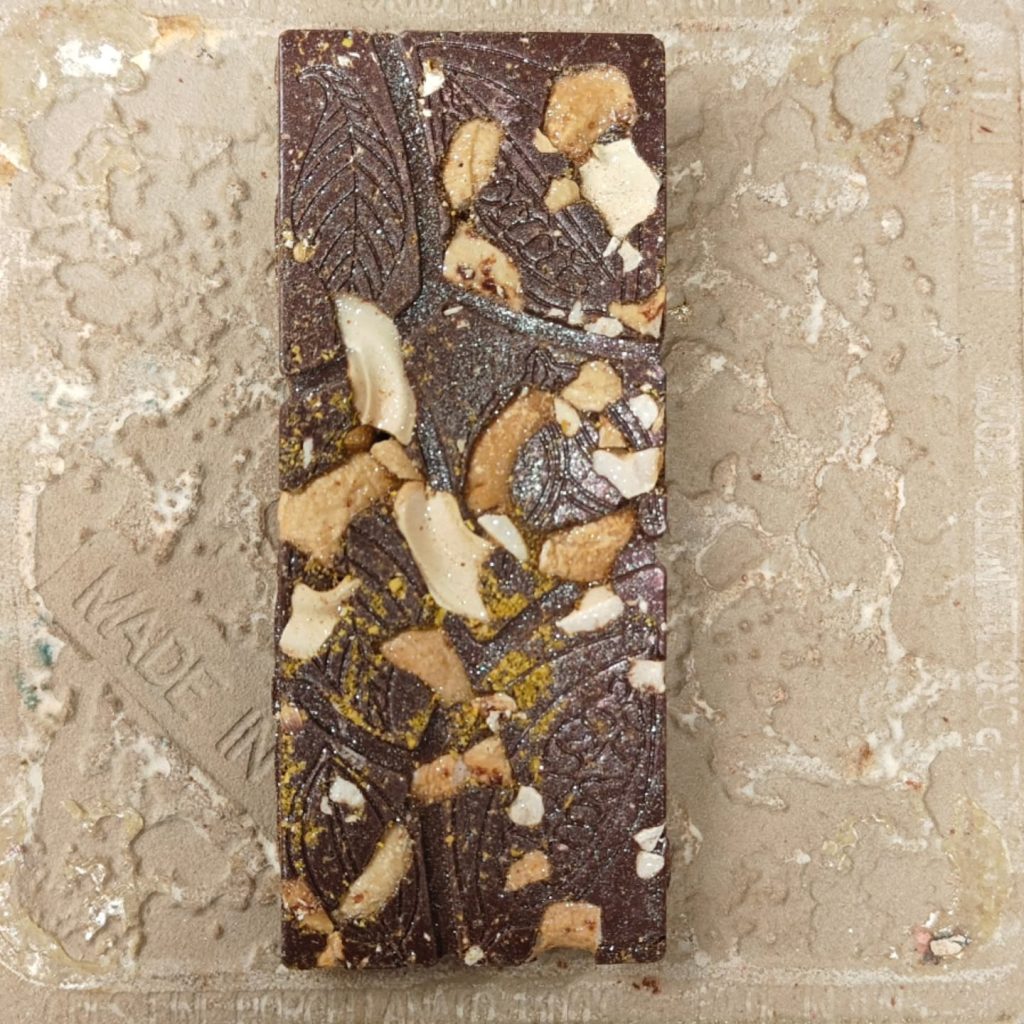 Mexico Almendra Blanca 75% very dark milk chocolate with curry and cashews.