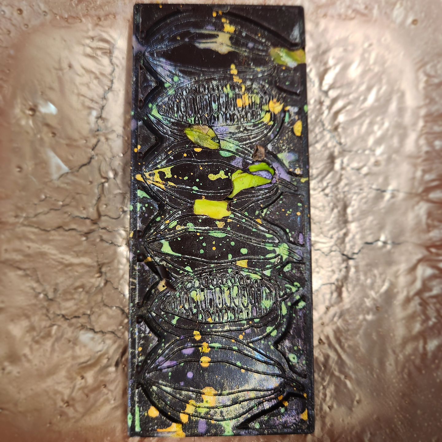 Bolivia Alto Beni Heirloom #1 70% Dark Chocolate with pistachios and a single dried Turkish apricot