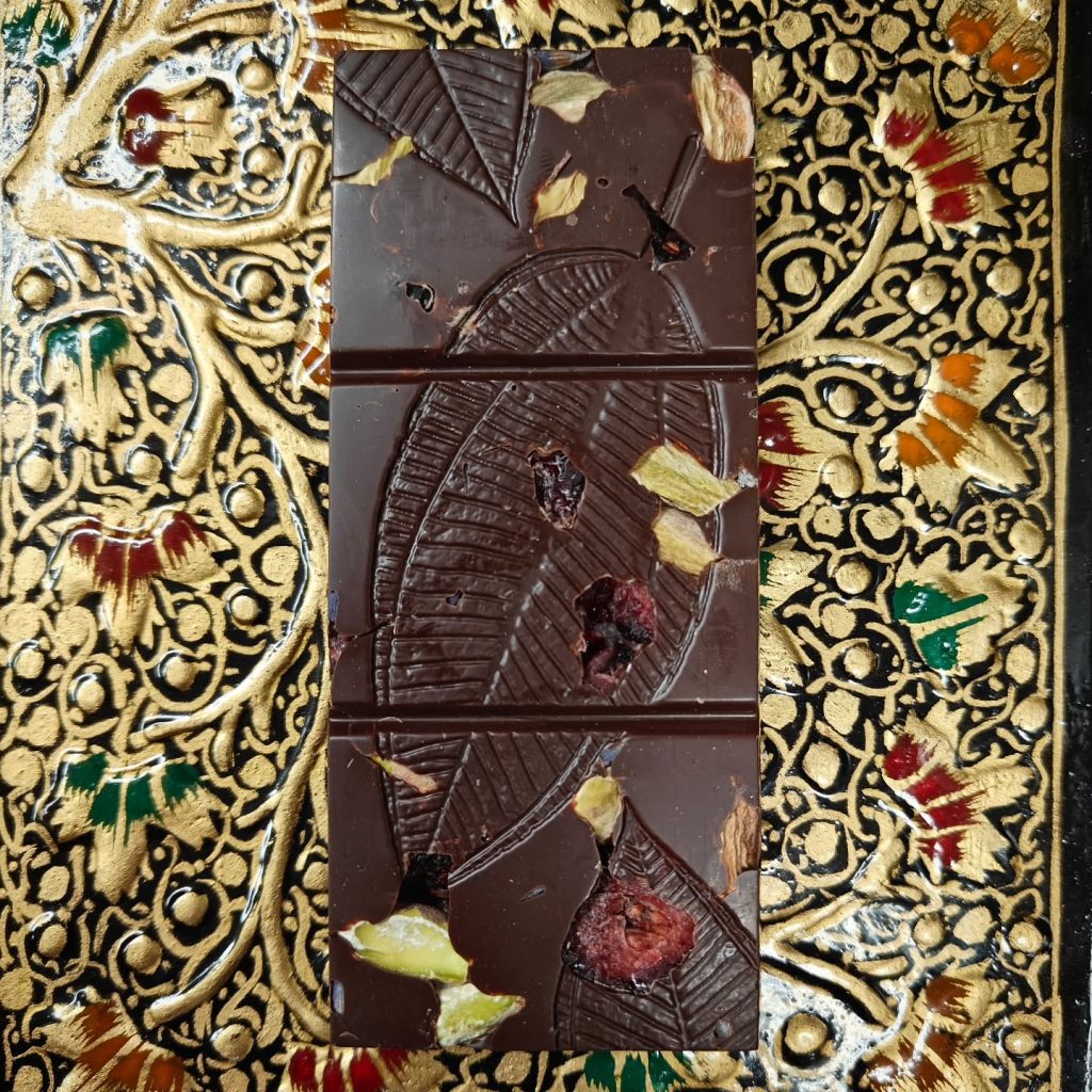 Here Nor There (Nor Anywhere) Bar March 3, 2025March 3, 2025Chocolate Bars Vietnam Lam Dong 70% dark chocolate with cranberries and pistachios.You out there! You here? You hear? Or there? Very funny. Berry funny. This is nuts. #chocolatebar #vietnam #chocolate