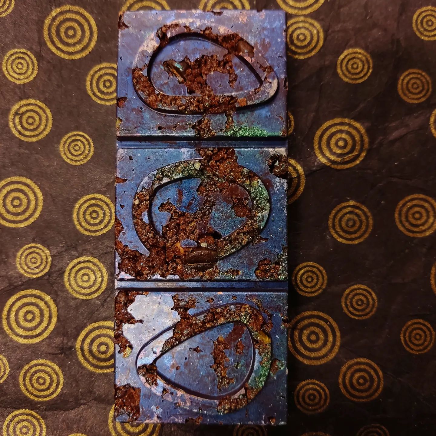INTERGALACTIC INDIGO bar. Pistachio Zen Brownie bits and espresso beans in a crazy Peru Ucayali River 70% dark blend.
