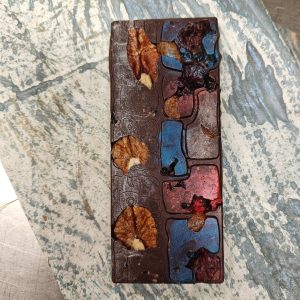 Bolivia Paredes Farm HCP No1 Heirloom dark chocolate with pecans, blueberries, cranberries, and candied Heirloom (HCP No2, if you must know) cacao beans.