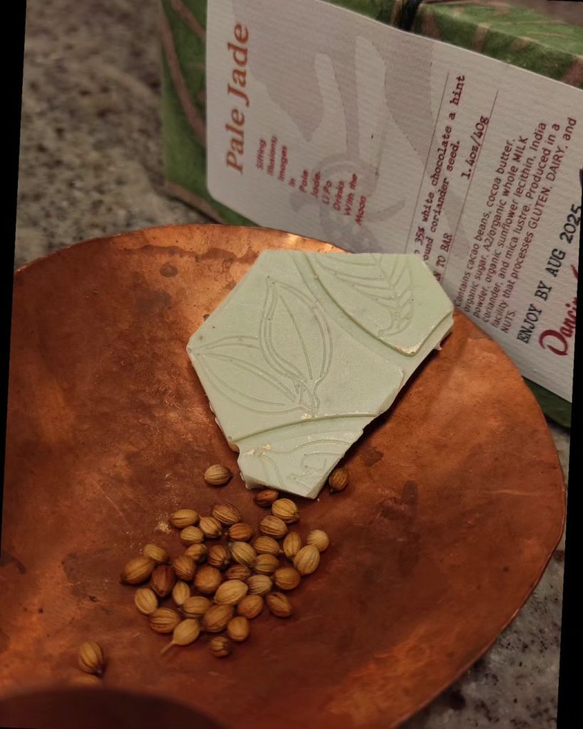 Pale Jade Bar June 11, 2024June 11, 2024Chocolate Bars Mexico 35% white chocolate with a hint of ground Indian coriander seed. SiftingIllusions;ImagesInPaleJade.Li PoDrinksWith theMoon