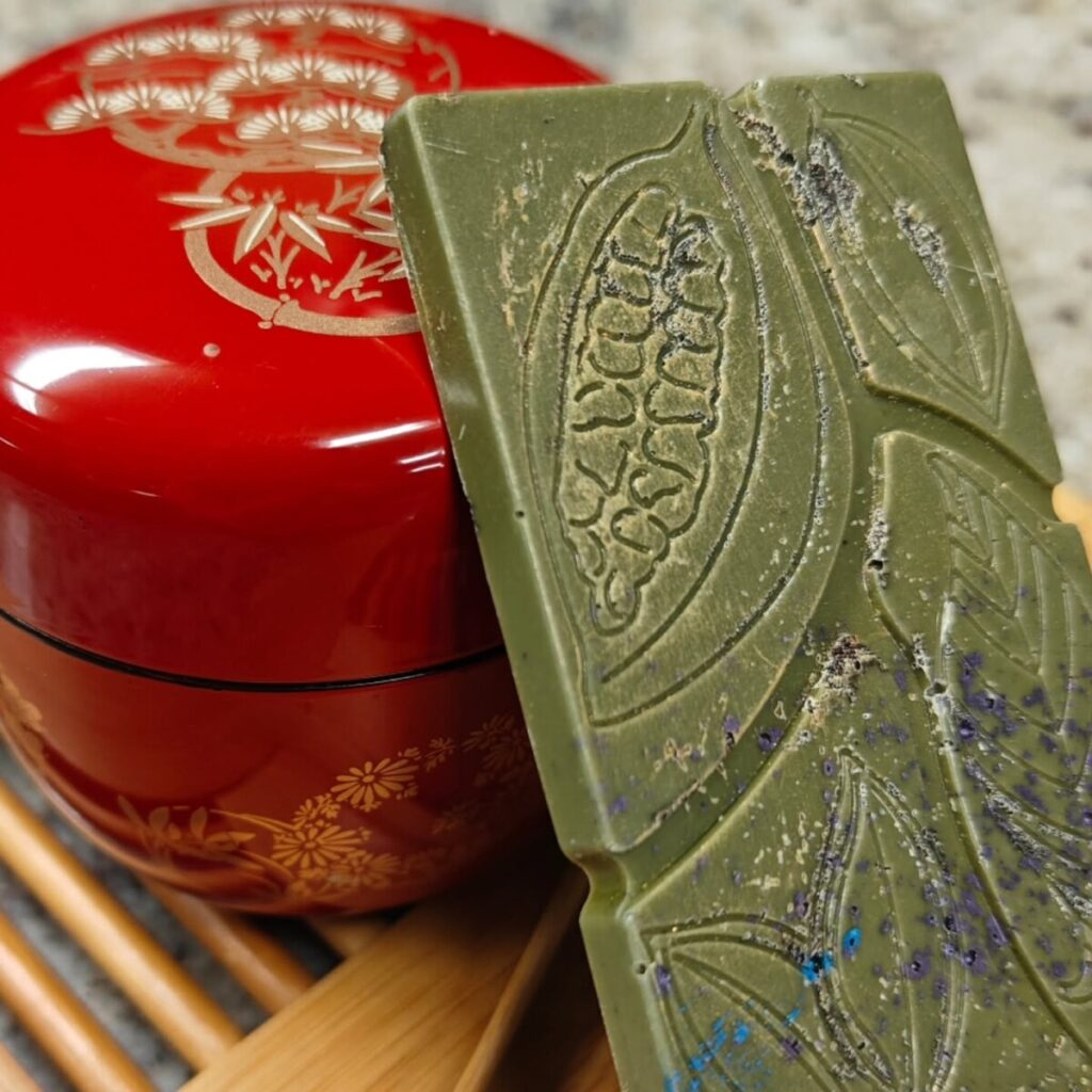 Ceremonial Kyoto Matcha white chocolate with scraped Sulawesi vanilla seeds and a grating of Grenada nutmeg.