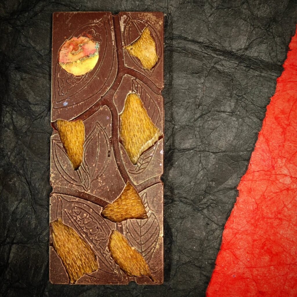 Puerto Rico Jeanmarie 68% dark chocolate with honey-candied local rhubarb, Persian lime, and a Bolivia Tranquilidad moon.