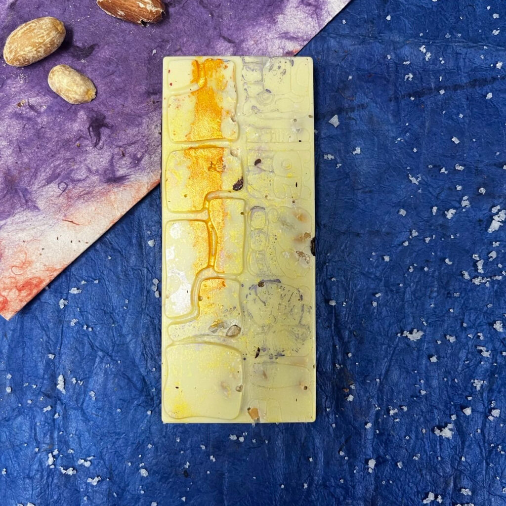Salted Mexico white chocolate over Bolivia Heirloom 100% dark with toasted peanuts and sunflower seeds and a sprinkling of blood orange sugar.