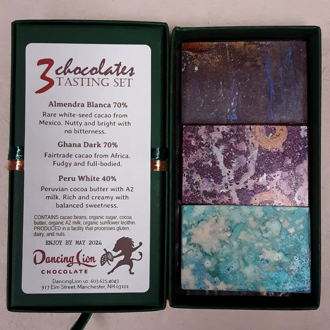 Tasting Set December 7, 2022December 13, 2022Chocolate Bars THREE CHOCOLATES Art & Chocolate Tasting Set. Mexico Almendra Blanca white bean 70% dark chocolate, crisp and elegantGhana 70% dark chocolate, fudgy and comforting Peru 40% white chocolate, milky and tart with balanced sweetness — SOLD OUT —