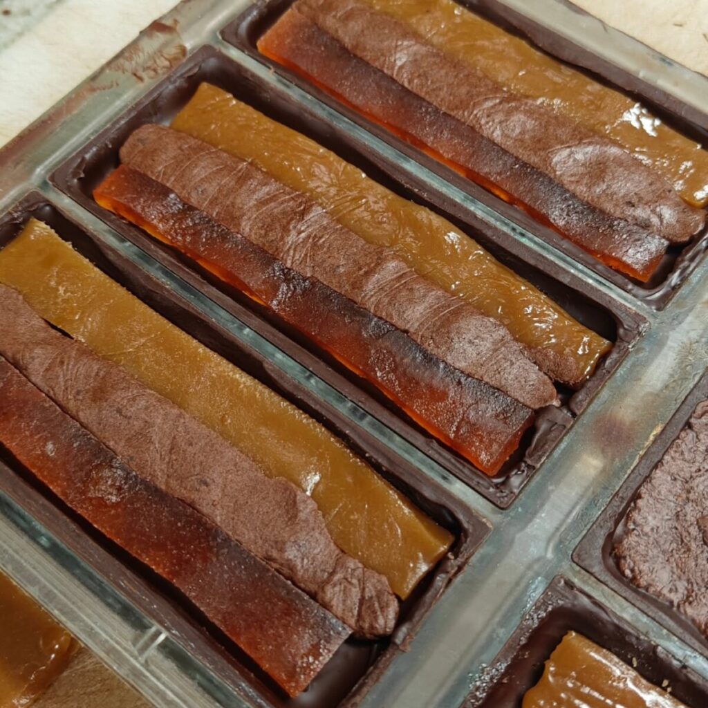 Triplicate. August 7, 2025August 9, 2025Chocolate Bars Crazy triple-filled chocolate bars in progress: citrus fruit paté, caramel, and chocolate red bean nougat. #chocolatier #chocolatebar #dayinthelife