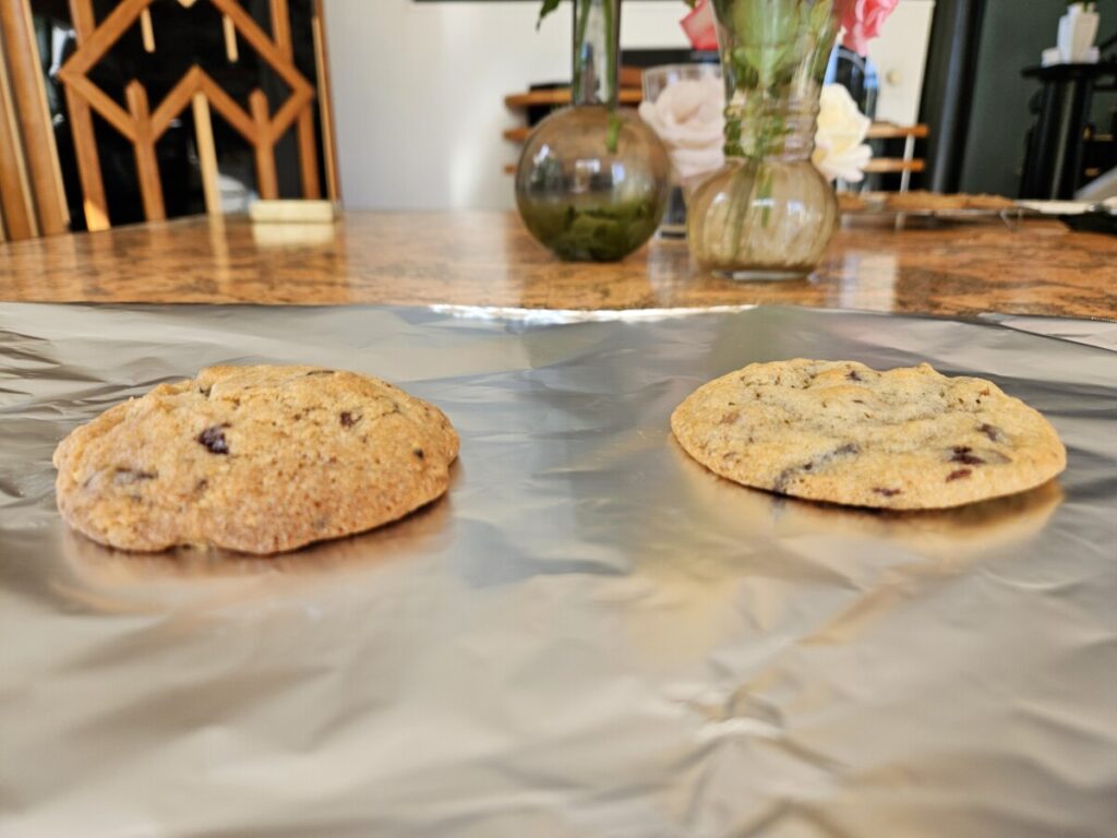 Per Donna’s comment, we know that the dough temperature when baked has a major impact on spread–cooler dough sets faster on the outside before the center can flatten. Here in Atenas, I only left the dough out of the refrigerator a few minutes before cutting, rounding, and baking.