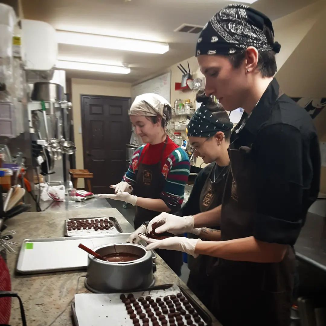 Making Truffles. Care to Learn? September 17, 2022September 17, 2022Classes & Events ANABEL, Rachel, and Shaman share a group truffle enrobing session. Learn to make truffles at home with our upcoming Down & Dirty Truffles class this Thursday.