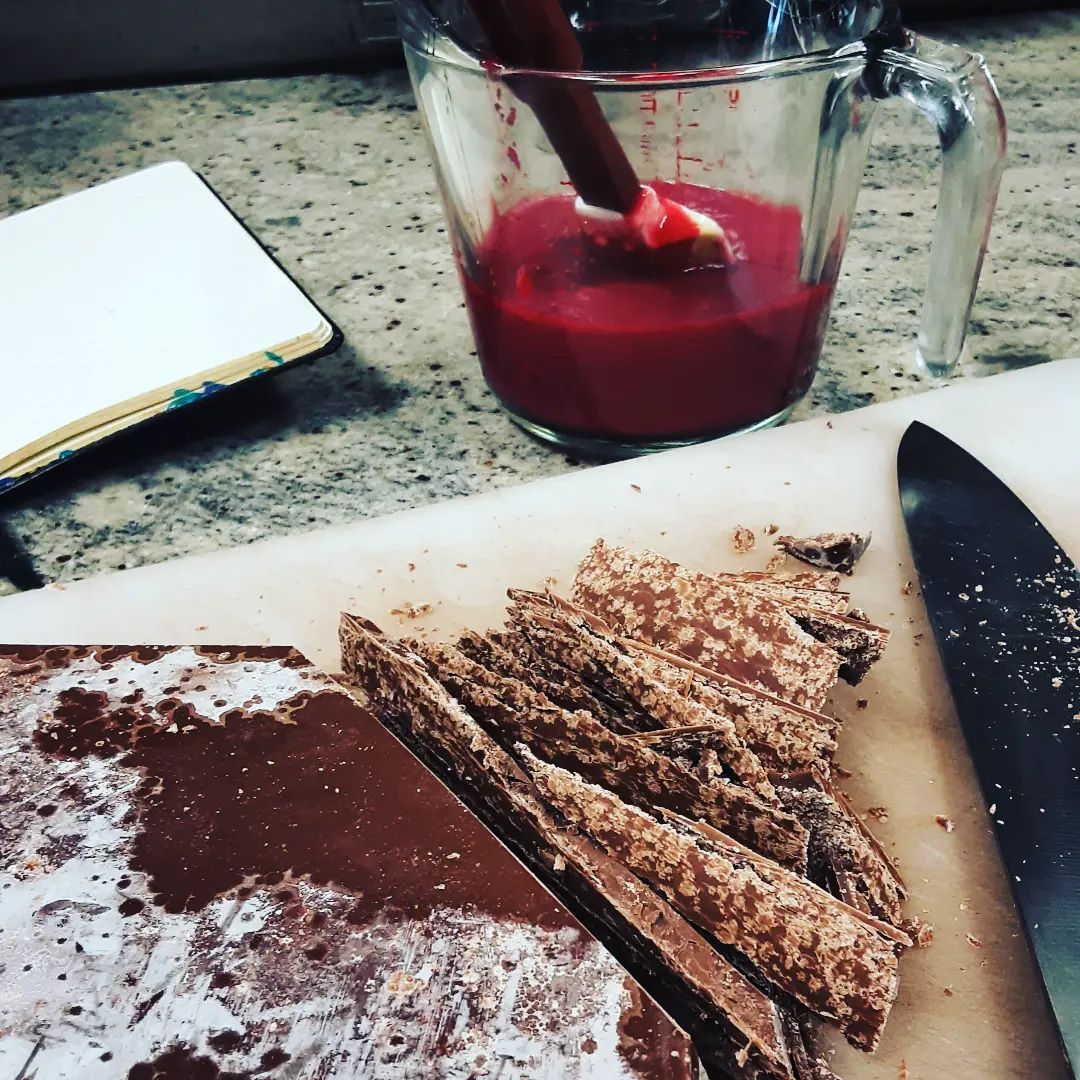 and Rich “mise-ing” for this afternoon’s Ecole Chocolat Recipe Development Ganache masterclass. This will be the 3rd Live Session for the course, and our students are doing great!That’s some seriously vibrant fresh raspberry puree in background. The chocolate is housemade Tanzania milk.