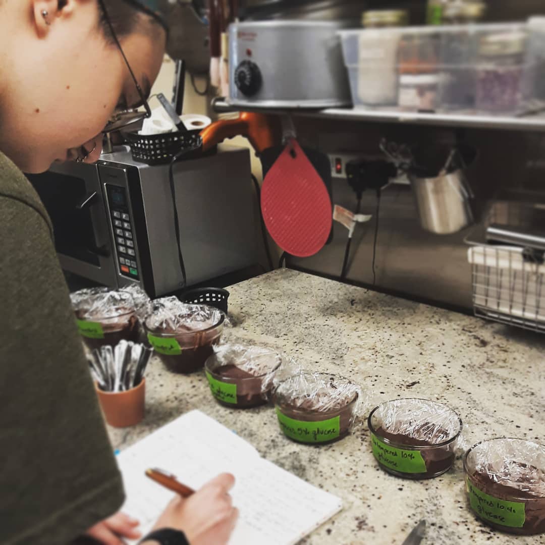 Apprentice Chocolatier Rachel performing experiments on ganache formulation and texture. We tend to treat the shop like the research laboratory I worked at back in the 1980s, except I’ve exchanged electro-optics and superconductive electronics for chocolate and ganache.