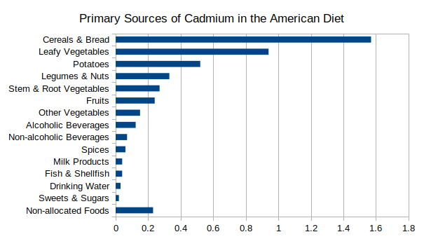 It has been demonstrated that we obtain most of our cadmium from cereals and bread, leafy vegetables, potatoes, legumes and nuts, and stem and root vegetables rather than from chocolate, which is not a significant contributor to overall cadmium in the typical American diet.[3,5]