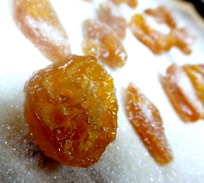It’s snowing outside. Inside, I’m candying the fresh calmondin that Mom Lowy sent from her tree in Panama City Beach, Florida. Calamondin is a tiny citrus with a tart orange-lemon flavor. I’ll use the syrup for bonbons, and will dip the candied rinds (pictured) in dark chocolate.