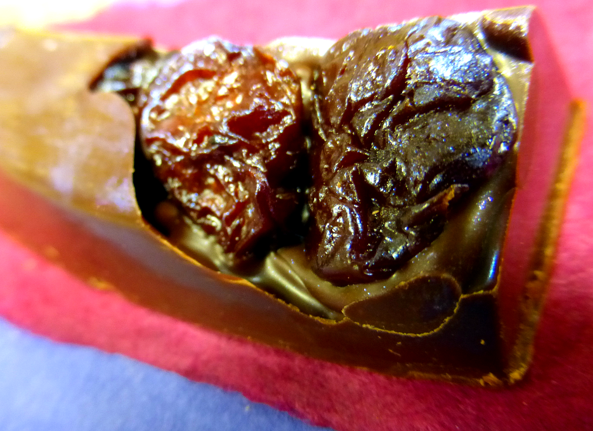 Tart cherries stud a shell filled with caramelized rhubarb ganache with Axiom 60% dark chocolate