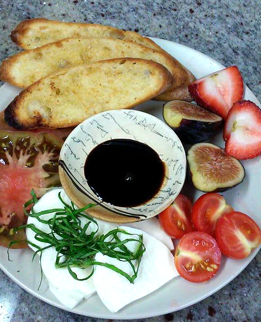 Lunch this Week is Garlic Balsamic Crostini with heirloom tomatoes and figs July 14, 2015Past is Passed Week of July 14 Lunch @th Lion is deconstructed crostini with figs, heirloom tomatoes, and balsamic reduction.