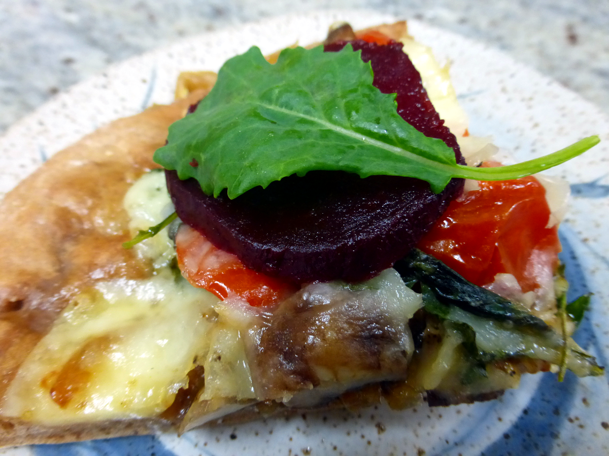 Pizza! March 10, 2015Past is Passed Week of March 10 Lunch&Dinner @the Lion is PIZZA on an Ecuador cocoa powder crust, finished with kale and a slice of red beet.