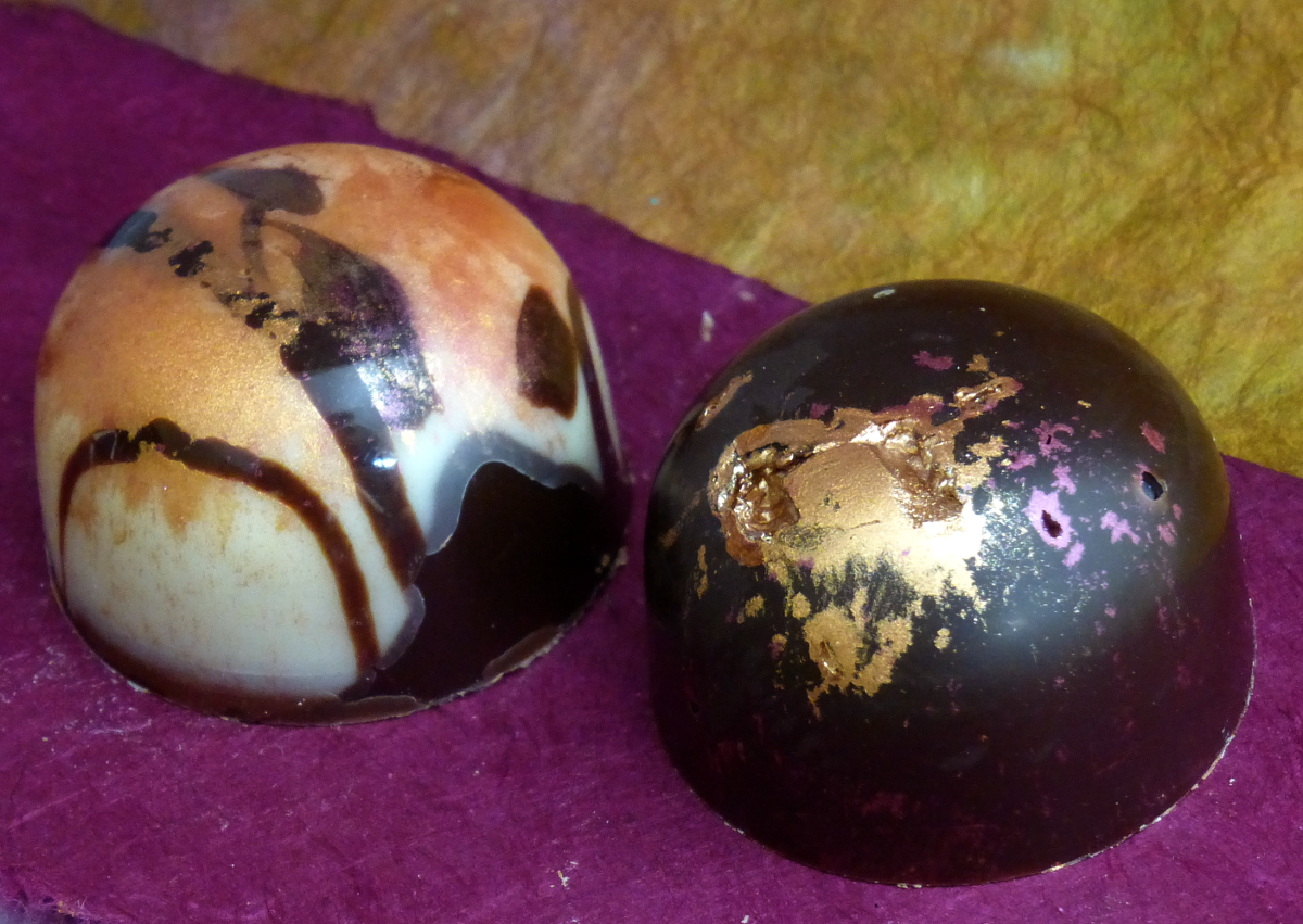 Montagne Bleue black tea with Meyer lemons in a blend of milk chocolate & Ecuador dark chocolate. Some finished in dark, some in white.