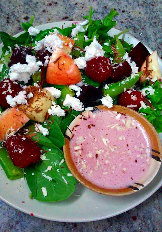 Week of July 7 Lunch @the Lion: Beet salad with Pomegranate vinaigrette July 8, 2015Past is Passed This week’s lunch is Roasted beet, raspberry, and goat cheese salad with pomegranate-garlic vinaigrette, topped with Peruvian dark and Ivoire white chocolates.
