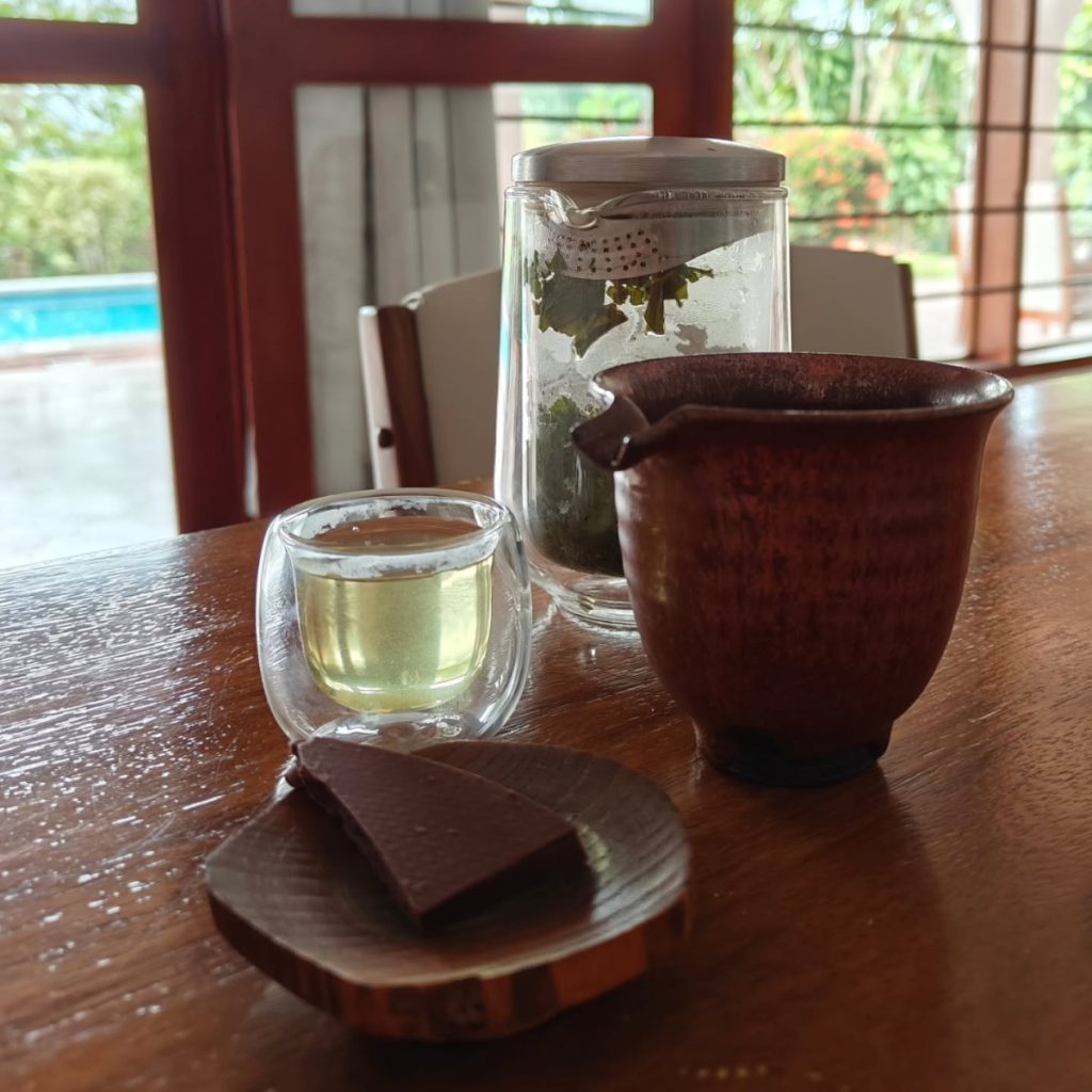CHOCOLATE & TEA. I’m tasting our new Guatemala 68% dark chocolate. The flavor is nuts and strawberries with a bold but balanced astringency. The aftertaste is smooth and bright, with lingering fresh berry acidity and a sultry astringency.