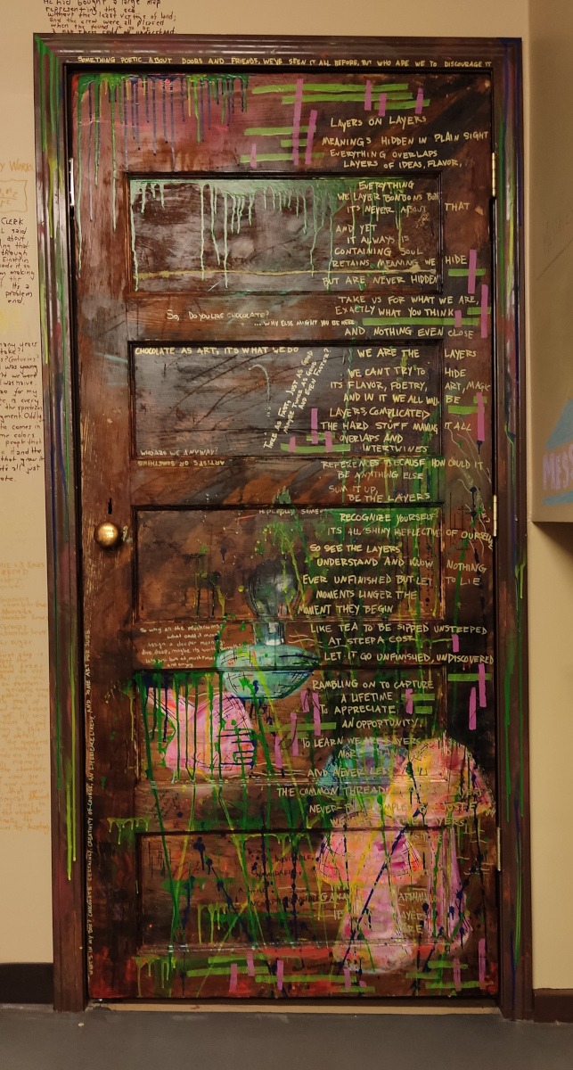Layers on Doors, Leaf Comstock 2023 Layers on Layers Meanings hidden in plain sight Everything overlaps Layers of ideas, flavor, Everything We layer bonbons but It's never about that And yet it always is Containing soul Retains meaning we hide But are never hidden Take us for what we are, Exactly what you think And nothing even close We are the layers We can't try to hide Its flavor, poetry, art, magic And in it we all will be Layers, complicated The hard stuff making it all Overlaps and intertwines References because how could it Be anything else