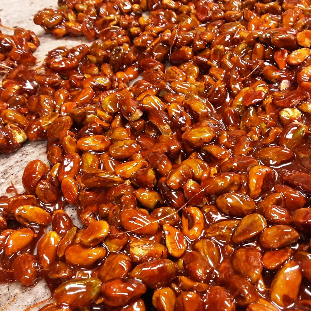 Rachel just made this pistachio praliné for candy bars and other things. Praliné is a French technique for toasting nuts in hot sugar, cooling completely until the sugar is brittle, then grinding to a flavorful paste. We consider praliné to be a fundamental chocolatier technique, along with ganache, caramel, and gianduja.
