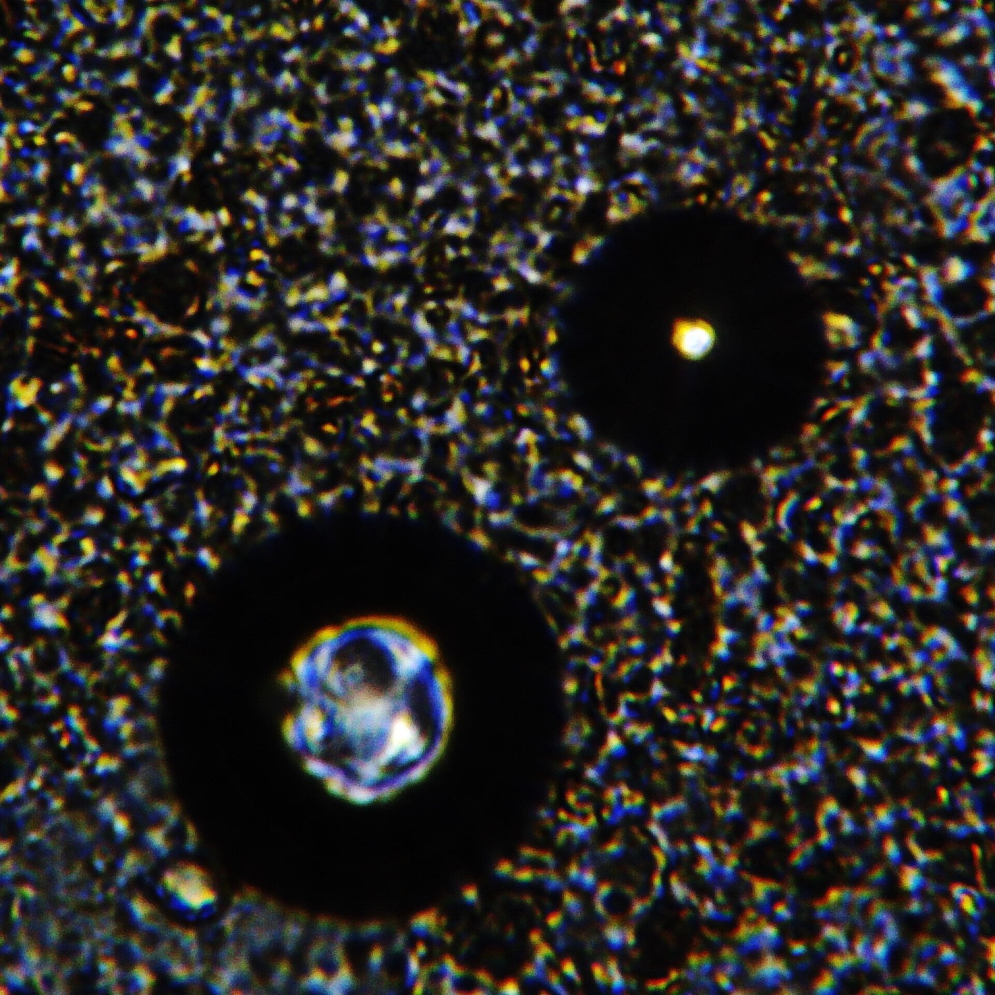 We’re looking at a sample of Caramelized Milk Chocolate ganache with Cloves and Saffron under a microscope at 40x. We’re not yet sure what these spherical structures are, but the surrounding material is the fat-in-water emulsion we call “ganache.”