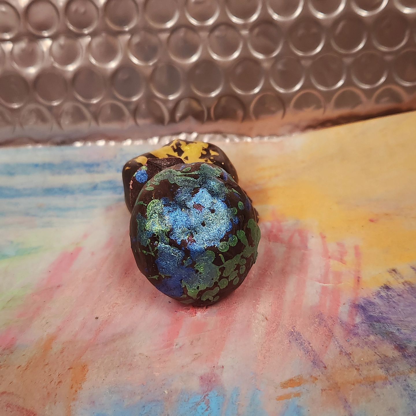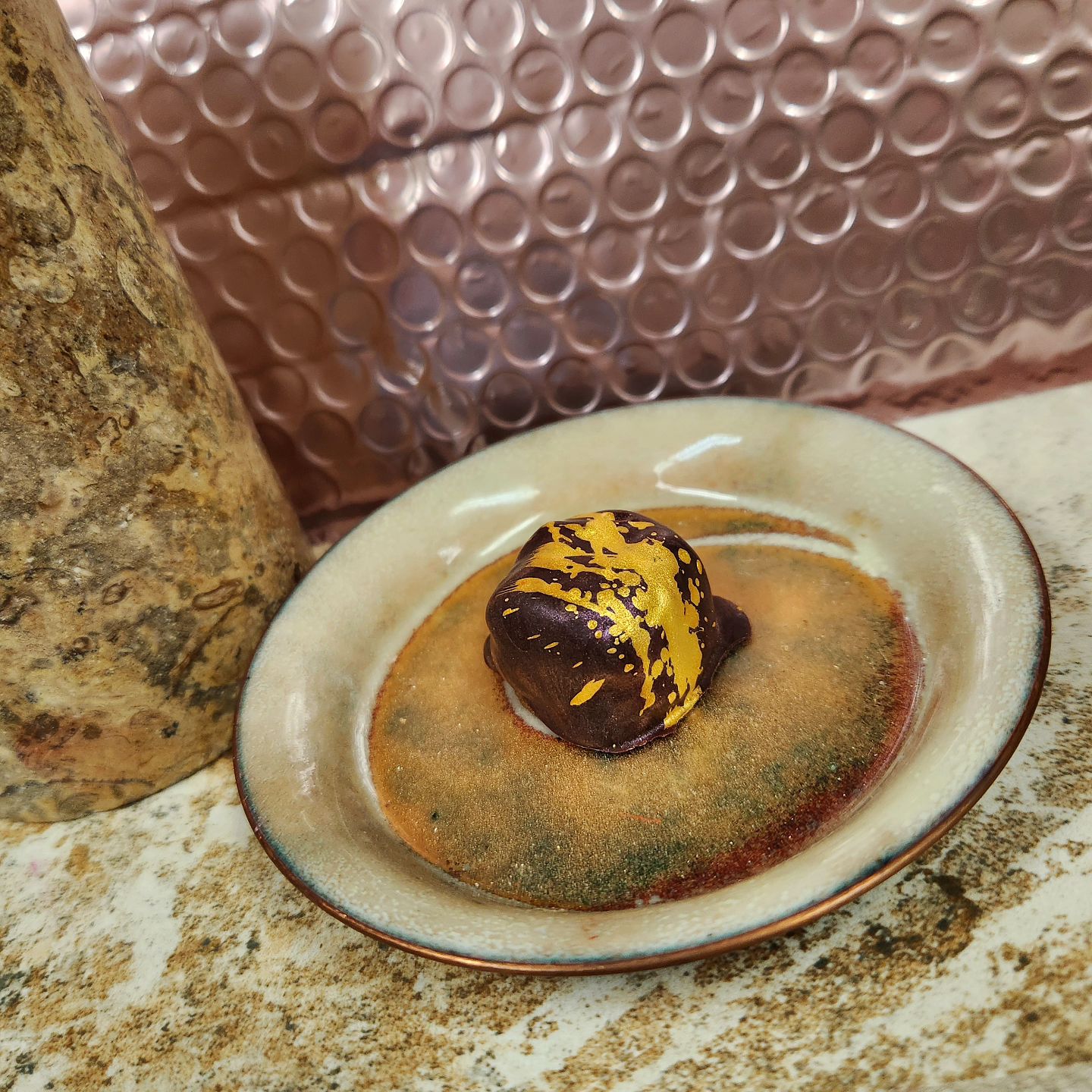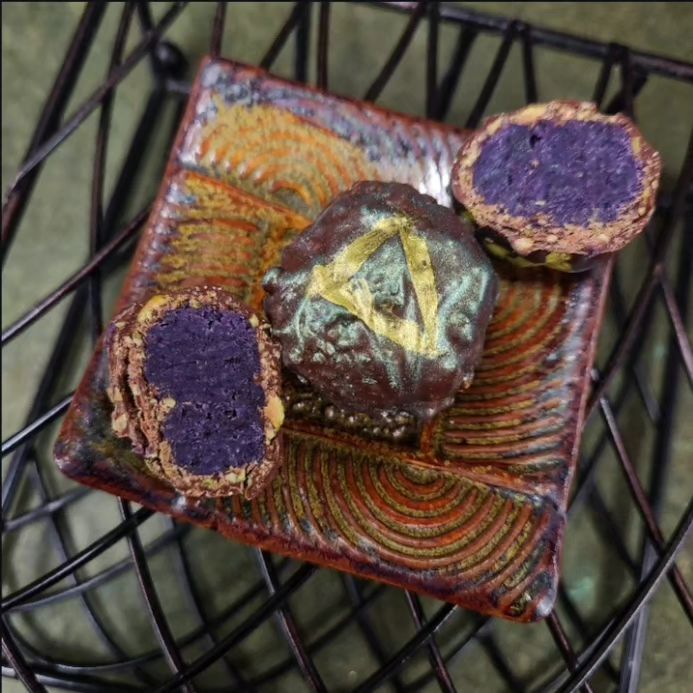Art Class • Strawberry-ginger ganache finished in bright Bolivia Alto Beni 70% Heirloom dark chocolate. Paint on the ceilingMica covering the floorBlue […]