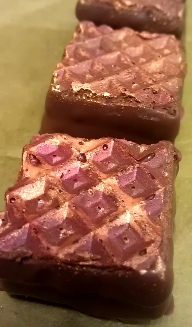 Ingredients: Kenshi 70% Dark Milk chocolate (cacao beans, organic sugar, powdered milk, cocoa butter), Tikal 43% Guatemalan milk chocolate (cacao beans, cocoa butter, sugar, milk powder, vanilla beans, non-GMO lecithin), Kate’s Butter, Mesocacao 100% Matagalpa Nicaraguan dark chocolate (cacao beans), Jivara 45% milk chocolate (cocoa butter, whole milk powder, sugar, cocoa beans, brown sugar, natural vanilla extract, non-GMO soya lecithin, barley malt extract), cognac.