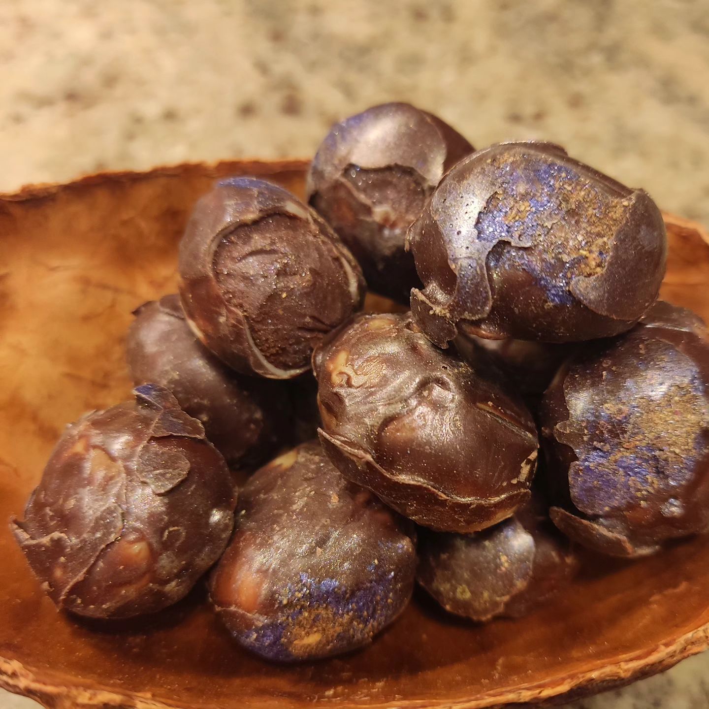 ANGRY ANGEL – There’s really nothing angry about these. Montagne Bleue tea with Puerto Rico dark chocolate finished in Mexico white and Bolivia Tranquilidad and dusted with Baharat (Silk Road Spice). They taste blue.