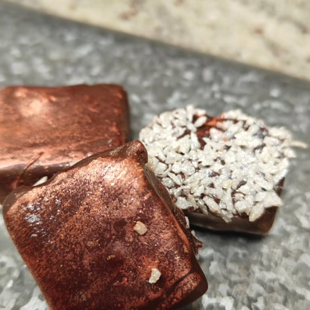 WHENCE WINTER? – shredded coconut with Ghana dark chocolate surrounds an apricot coconut almond honey chew.